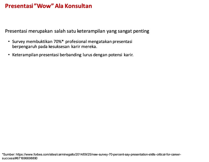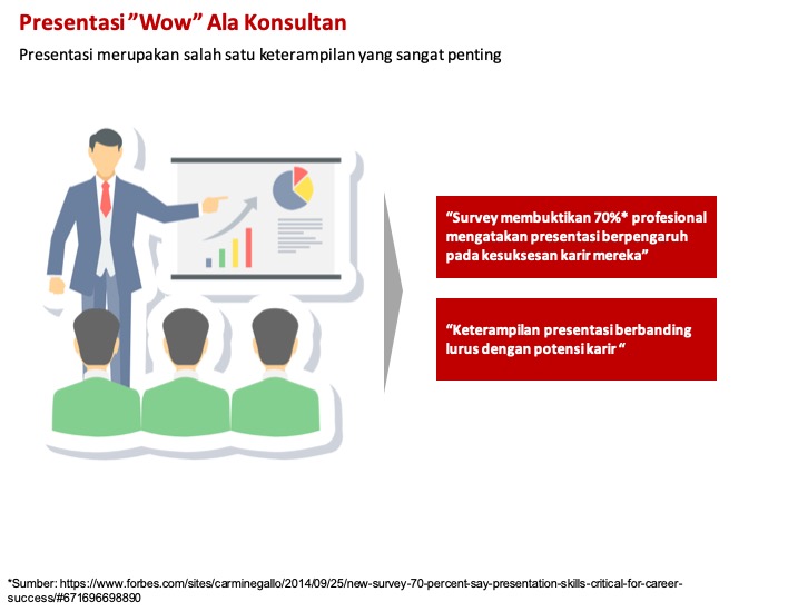 Survey membuktikan 70% profesional di Amerika Serikat mengatakan presentasi adalah salah satu skill yang mempengaruhi terhadap kesuksesan karir mereka (sumber: forbes.com).