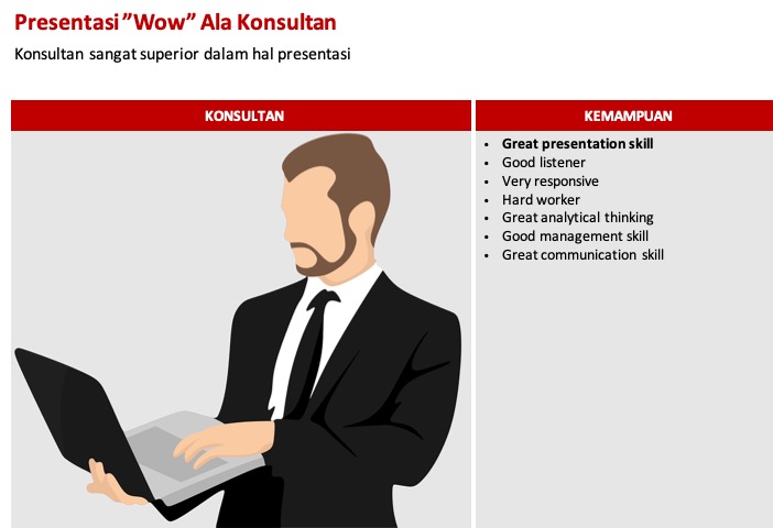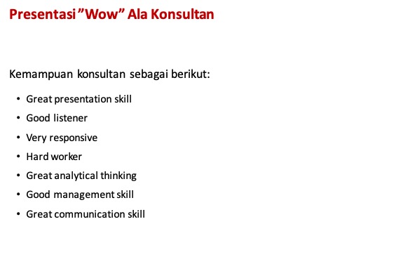 Konsultan sangatlah superior dalam hal menyampaikan presentasi ke klien. Keterampilan presentasi mumpuni ini juga diiringi dengan materi atau informasi yang disajikan dalam bentuk slide yang keren.
