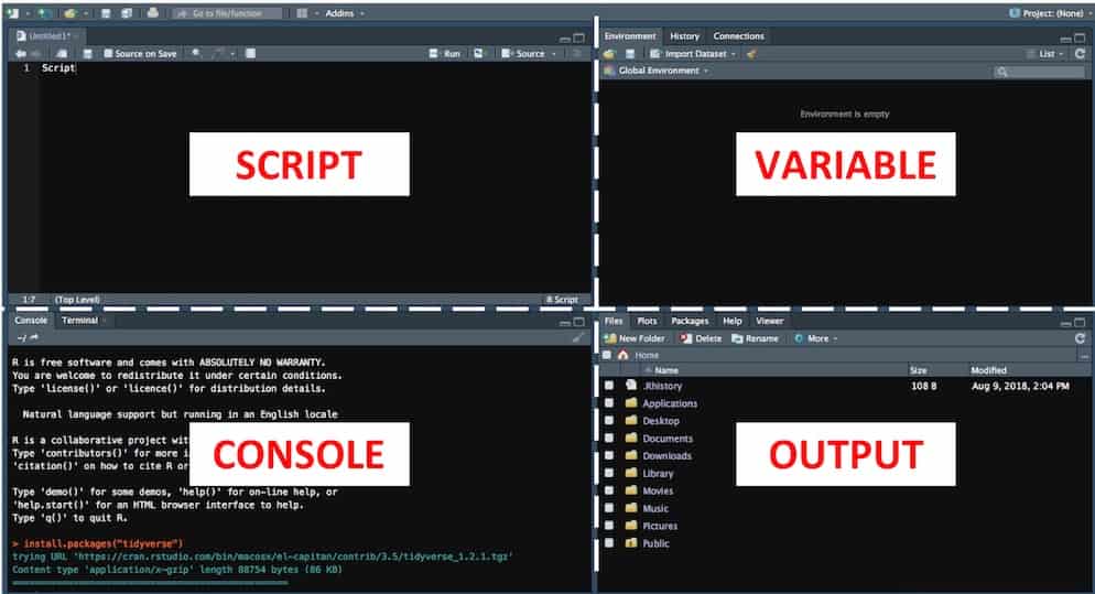 Layout RStudio terdiri dari bagian Script, Console, Variable, dan Output.
